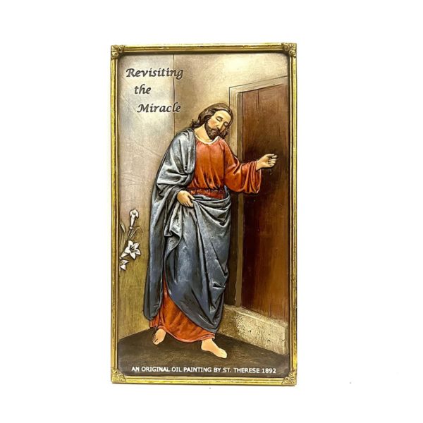 This beautiful plaque is based on an oil painting done by St. Therese in 1892. The colors and details in this piece are true to the original. Depicting Jesus as a hopeful visitor, gently knocking at the door, we are reminded that God wants to come into our hearts. We need only to invite Him in!