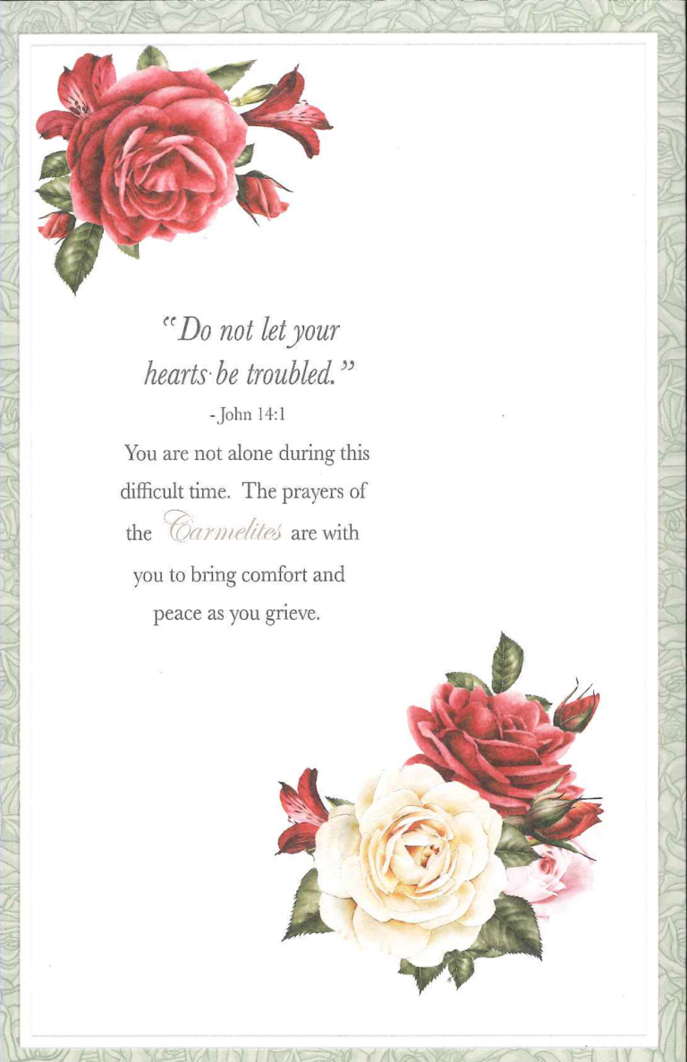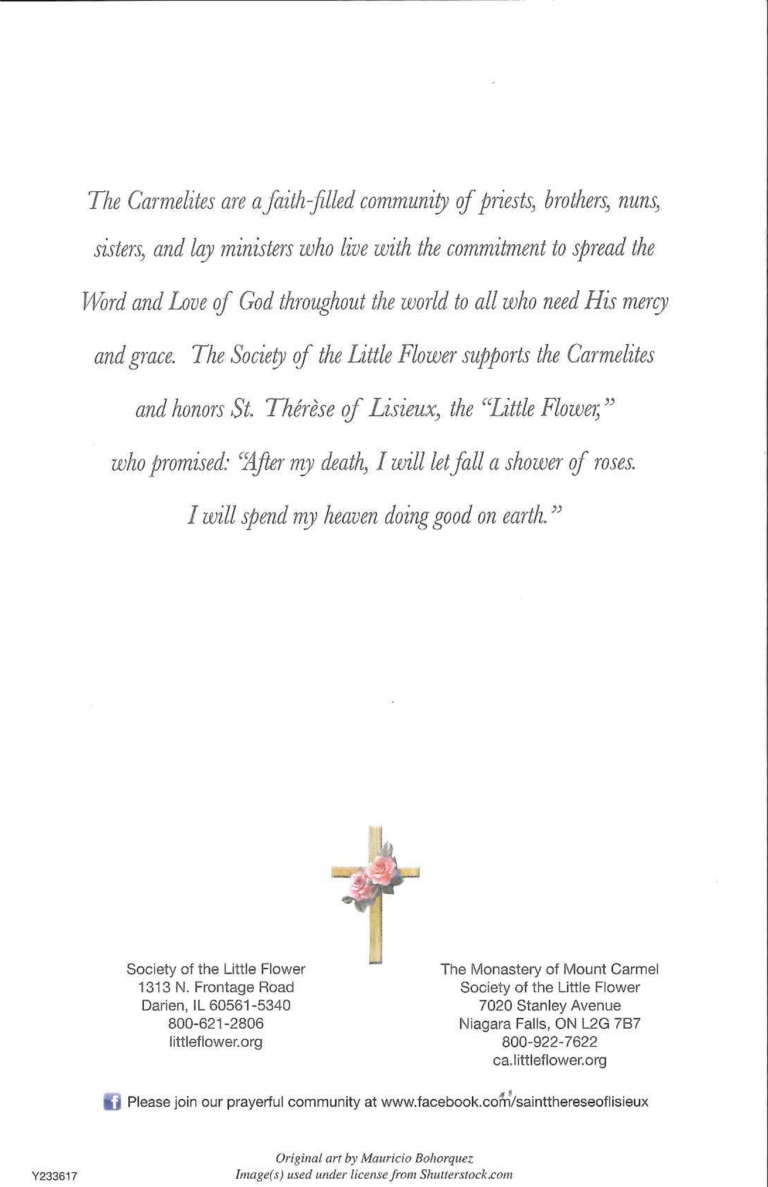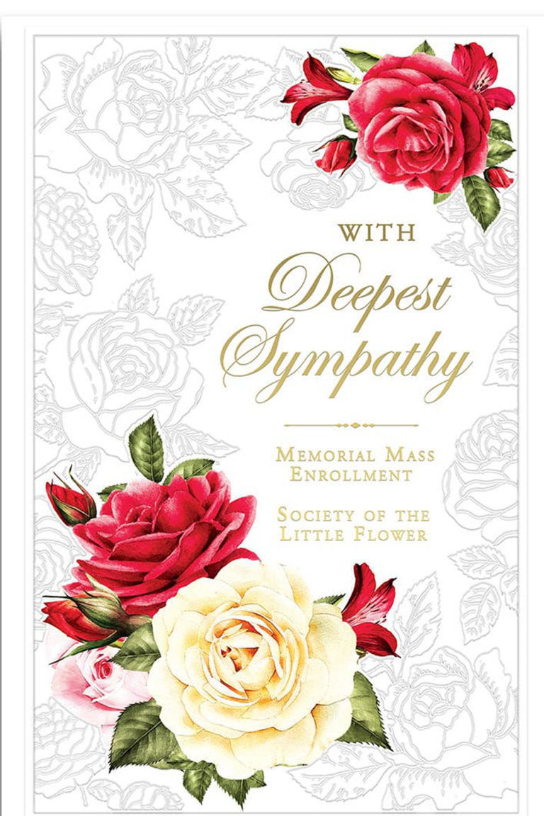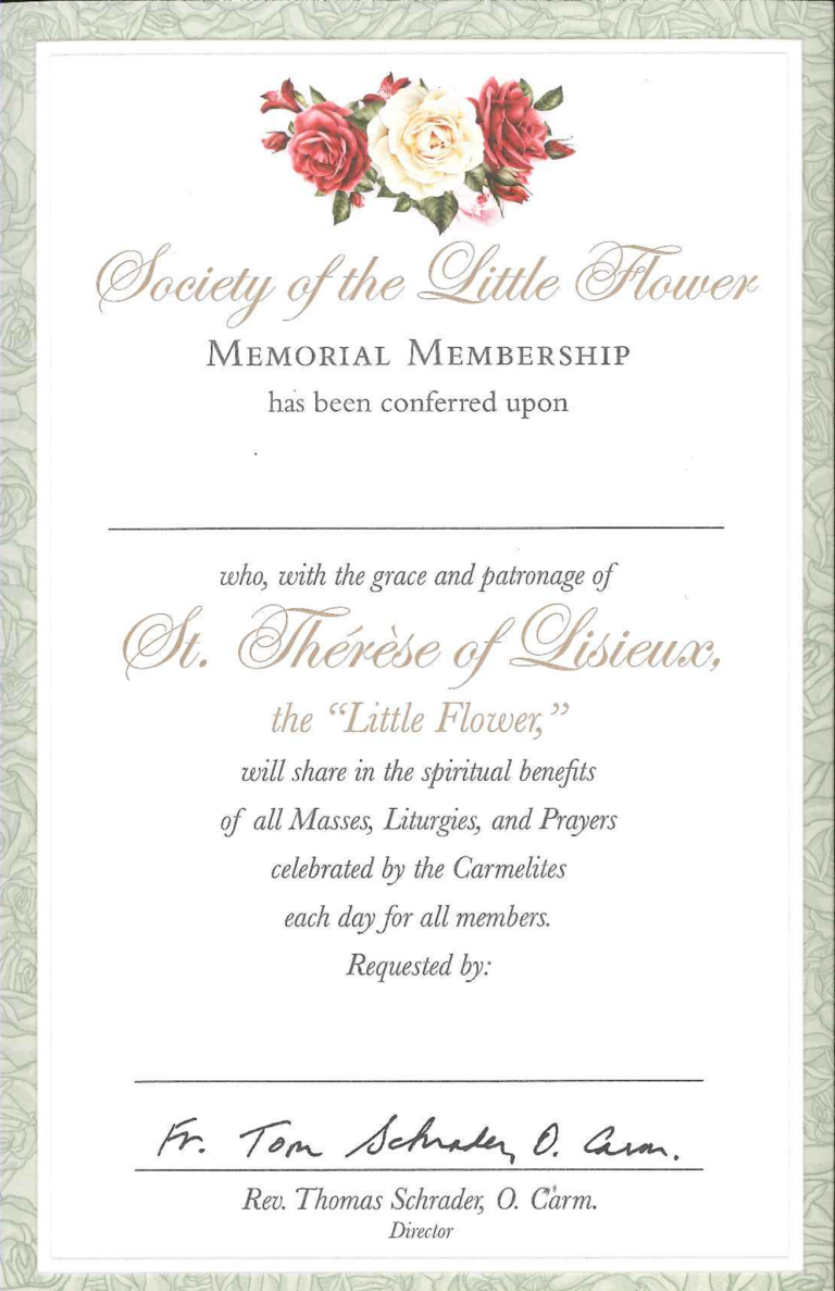 A Memorial Mass Card enrolls a deceased person in the Society of the Little Flower for a period of five years. The deceased is included in daily Mass and prayers celebrated each day for all members by the Carmelites.