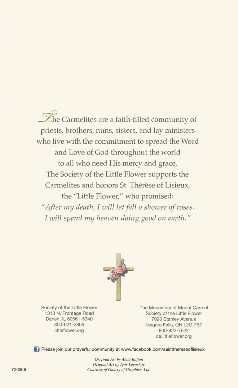 A special Living Mass Enrollment Card is bestowed upon a living person who will share in all spiritual benefits for a period of five years under the patronage of St. Therese. This Special Living Mass Enrollment can also be used for a birthday, anniversary, baptism, or any other occasion.